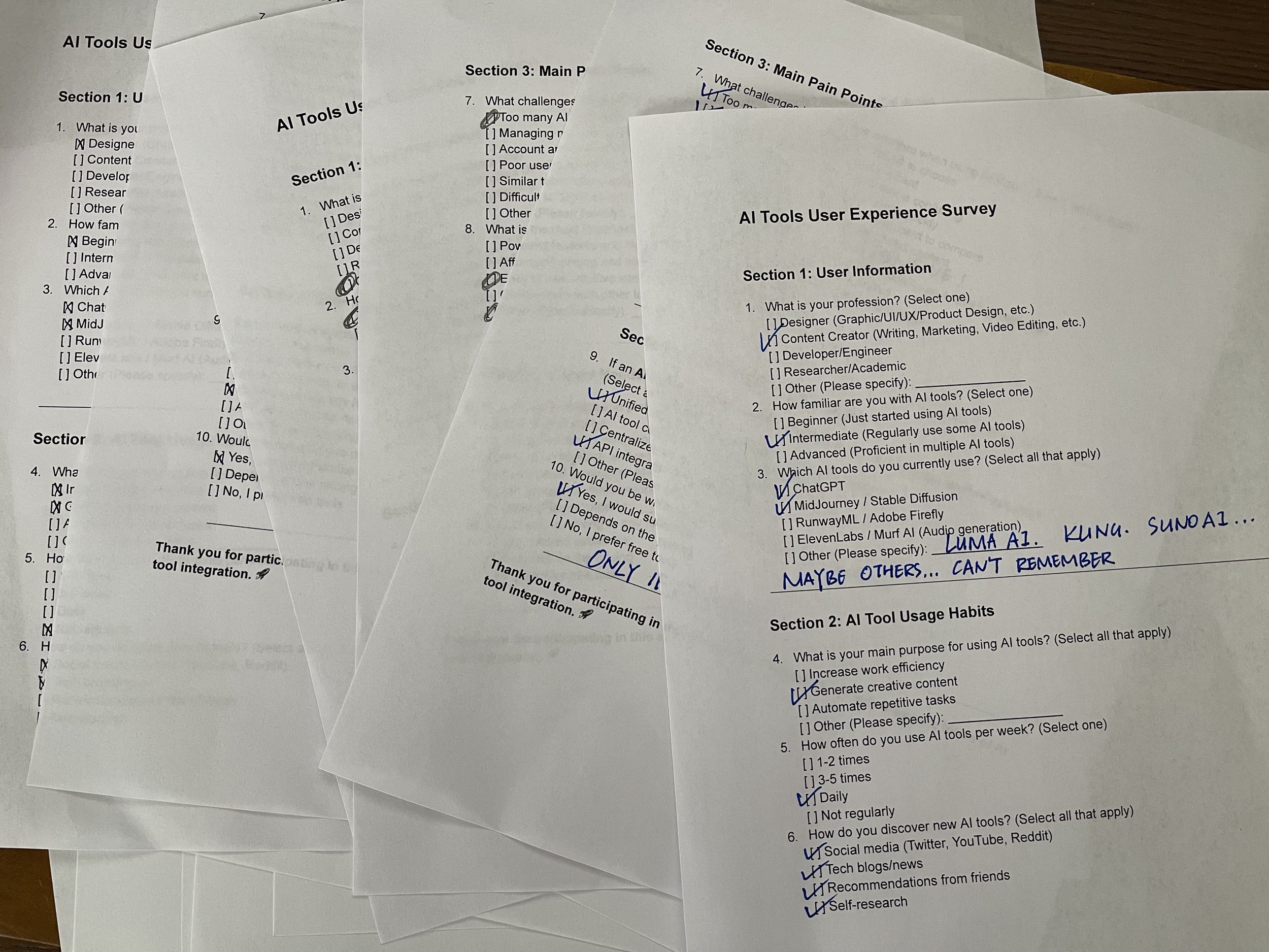 In our mixed-method study (survey + 1:1 interviews), 4 of 6 users reported juggling 2–4 AI tools per task.
