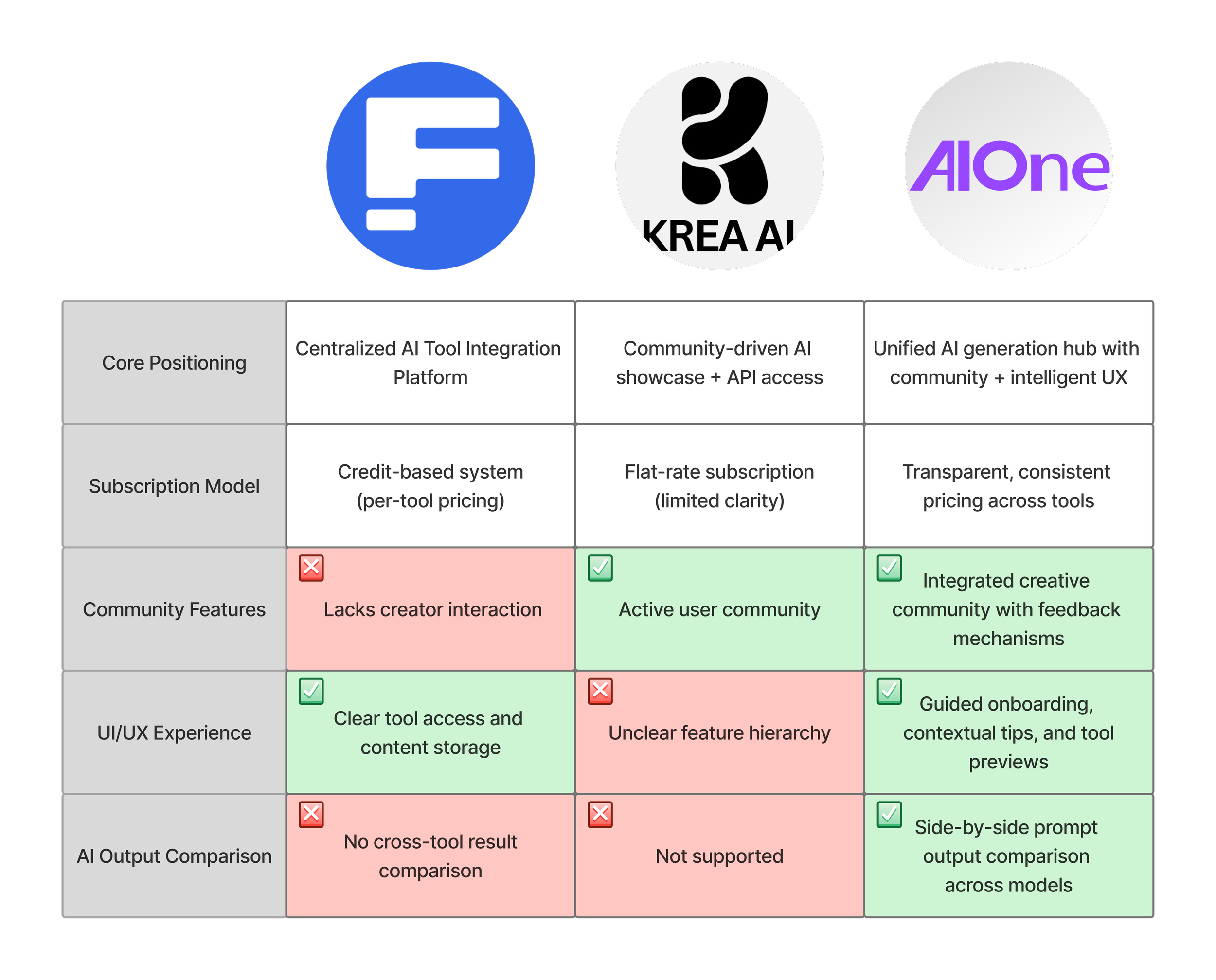 We conducted a competitive feature audit and UX walkthroughs of leading AI creation platforms (Freepik AI, Krea AI) to understand how tool integration affects user clarity, control, and confidence in creation. Fragmented tools, scattered outputs, and unclear credit systems forced users to manually manage assets—creating mental load and disrupting creative momentum.